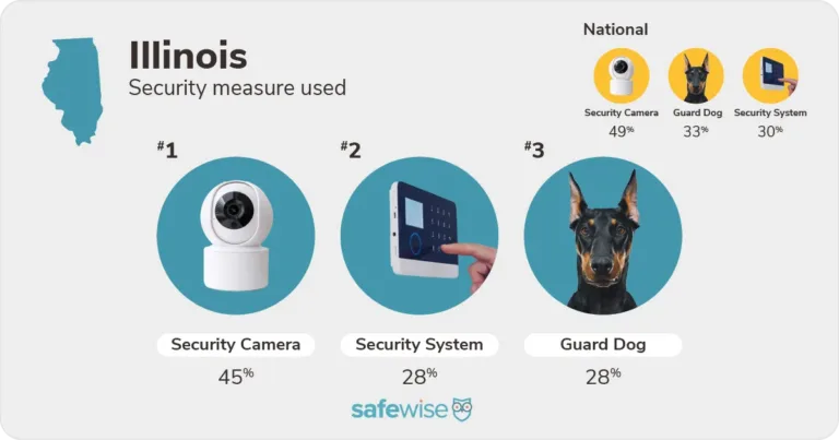 - Security cameras are the most-used form of property protection among Illinois residents, with 45% using them. Guard dogs and security systems tie for second at 28% each.