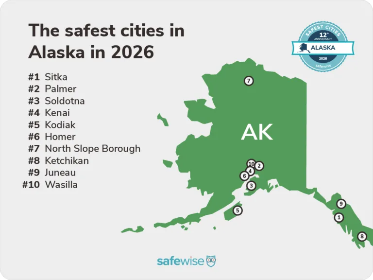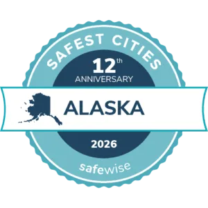 Map of the safest cities in Alaska for 2026, listing top 10 ranked cities based on SafeWise crime data. Image: SafeWise