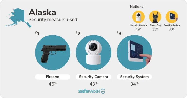 Top security measures used in Alaska (firearms, security cameras, and security systems) compared to national trends. Image: SafeWise