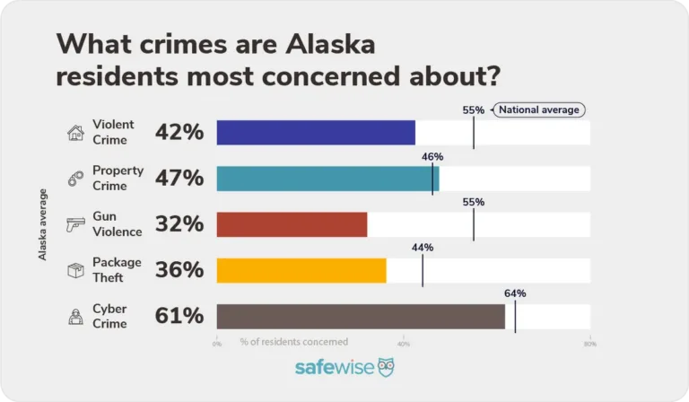 Bar chart showing the percentage of Alaska residents concerned about violent crime, property crime, gun violence, package theft, and cyber crime. Image: SafeWise