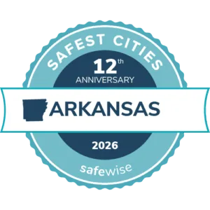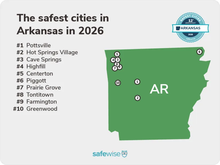 Map of the safest cities in Arkansas for 2026, listing top 10 ranked cities based on SafeWise crime data. Image: SafeWise