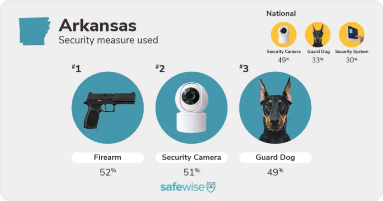Top security measures used in Arkansas: (firearms, security cameras, and guard dogs) compared to national trends. Image: SafeWise