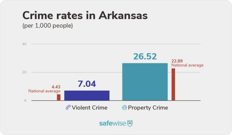 Bar chart comparing Arkansas violent and property crime rates to national averages. Arkansas is above average in both categories. Image: SafeWise