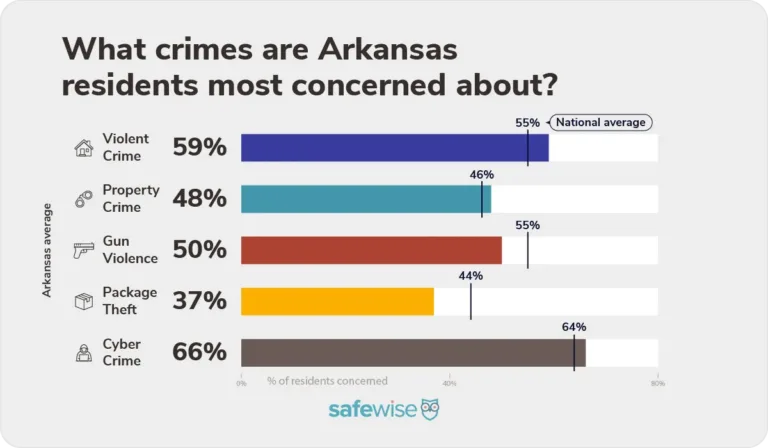 Bar chart showing the percentage of Arkansas residents concerned about violent crime, property crime, gun violence, package theft, and cyber crime. Image: SafeWise