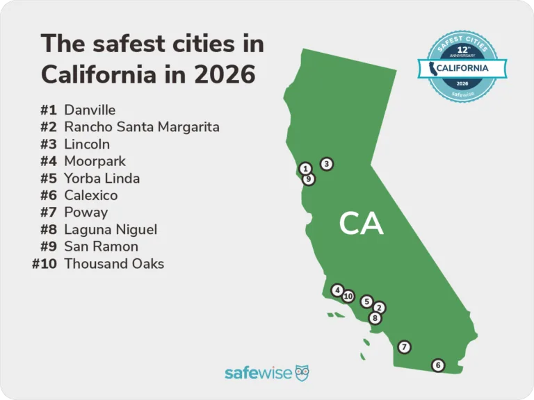 Map of the safest cities in California for 2026, listing top 10 ranked cities based on SafeWise crime data. Image: SafeWise