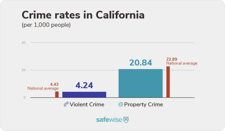 Bar chart comparing California violent and property crime rates to national averages. California is below average in both categories. Image: SafeWise