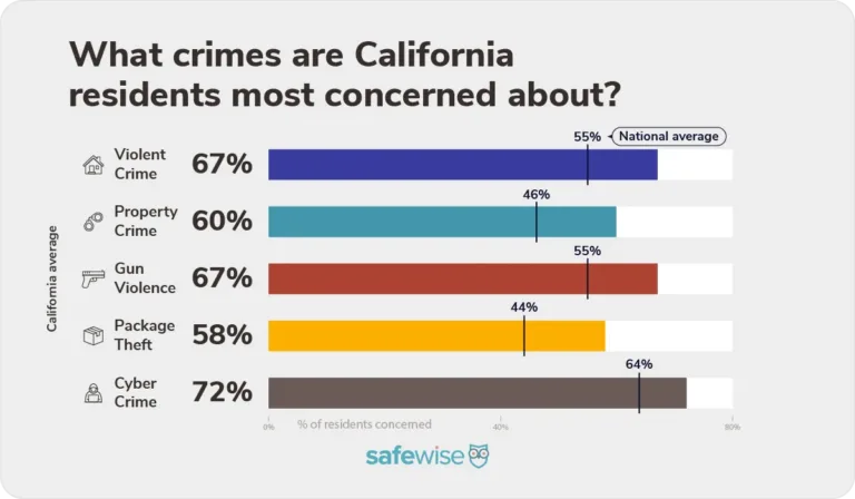 Bar chart showing the percentage of California residents concerned about violent crime, property crime, gun violence, package theft, and cyber crime. Image: SafeWise