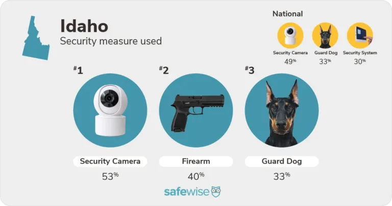 Top security measures used in Idaho (security cameras, firearms, and guard dogs) compared to national trends. Image: SafeWise