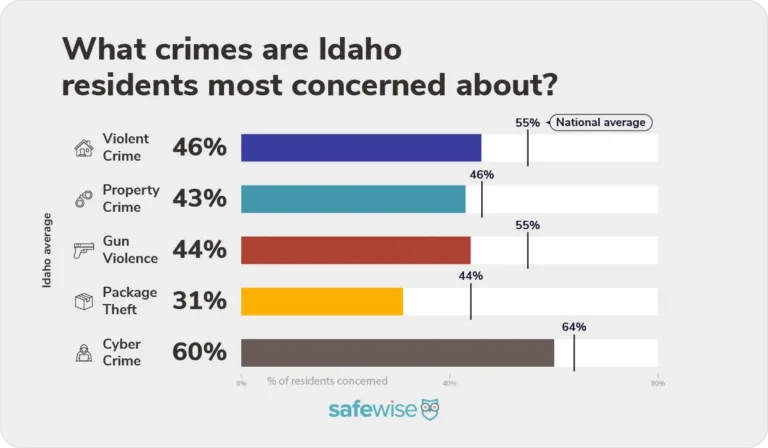 Bar chart showing the percentage of Idaho residents concerned about violent crime, property crime, gun violence, package theft, and cyber crime. Image: SafeWise