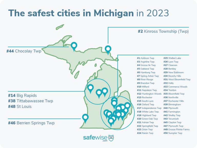 - Michigan's #1 safest city for 2025—Kinross Township—reported no violent crimes and a total of five property crimes.