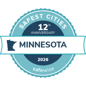 Map of the safest cities in Minnesota for 2026, listing top 10 ranked cities based on SafeWise crime data. Image: SafeWise