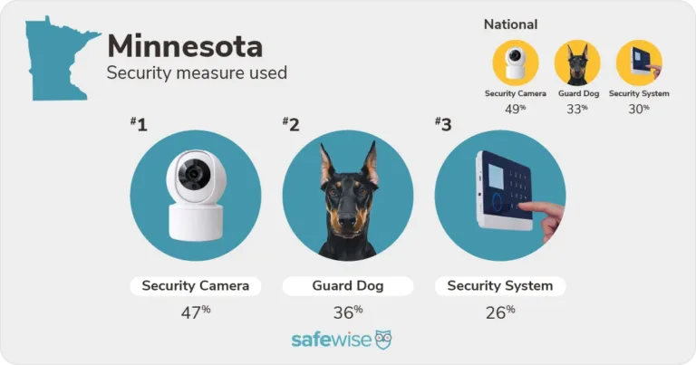 Top security measures used in Minnesota (security cameras, guard dogs, and security systems) compared to national trends. Image: SafeWise