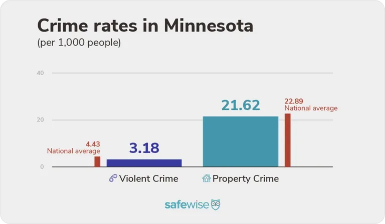 Bar chart comparing Minnesota violent and property crime rates to national averages. Minnesota is below average in both categories. Image: SafeWise