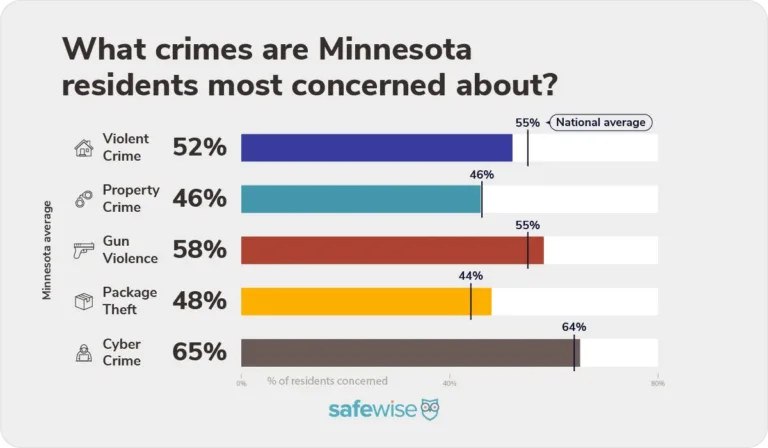 Bar chart showing the percentage of Minnesota residents concerned about violent crime, property crime, gun violence, package theft, and cyber crime. Image: SafeWise