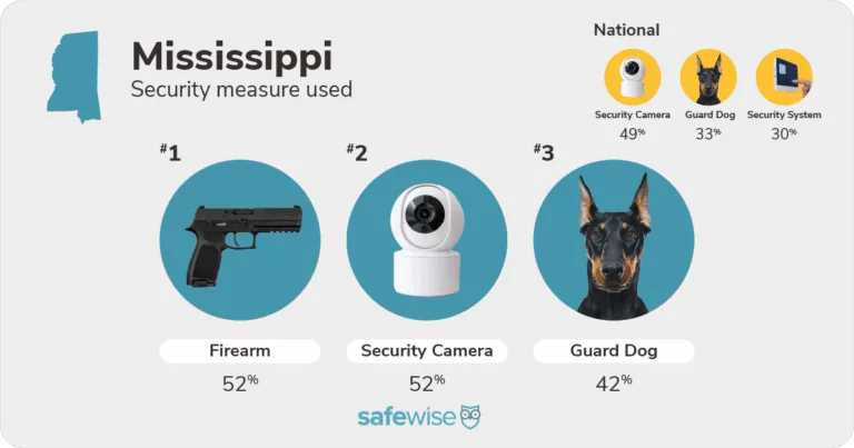 Top security measures used in Mississippi (firearms, security cameras, and guard dogs) compared to national trends. Image: SafeWise