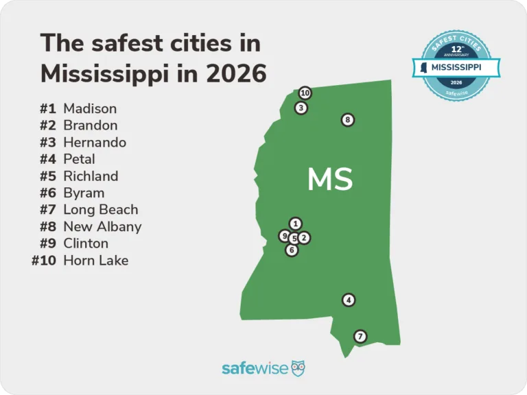 Map of the safest cities in Mississippi for 2026, listing top 10 ranked cities based on SafeWise crime data. Image: SafeWise