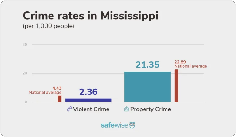 Bar chart comparing Mississippi violent and property crime rates to national averages. Mississippi is below average in both categories. Image: SafeWise