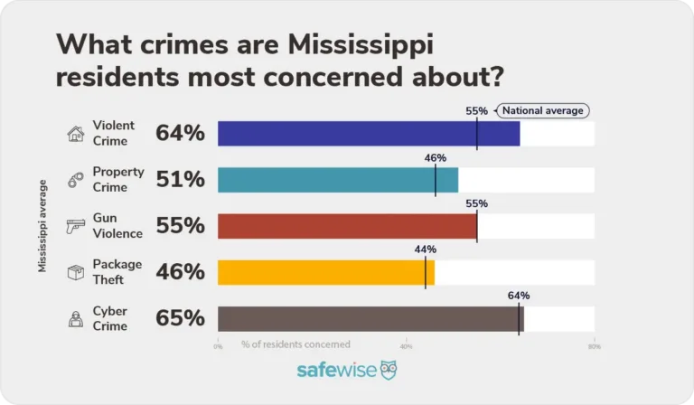 Bar chart showing the percentage of Mississippi residents concerned about violent crime, property crime, gun violence, package theft, and cyber crime. Image: SafeWise