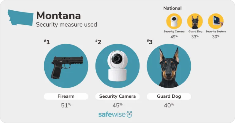 Top security measures used in Montana (firearms, security cameras, and guard dogs) compared to national trends. Image: SafeWise
