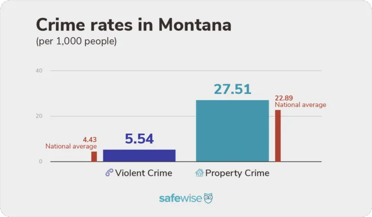 Bar chart comparing Montana violent and property crime rates to national averages. Montana is above average in both categories. Image: SafeWise