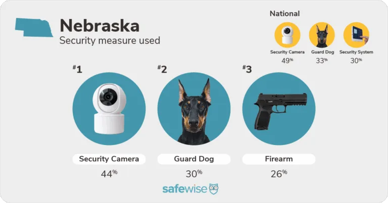 Top security measures used in Nebraska (security cameras, guard dogs, and firearms) compared to national trends. Image: SafeWise