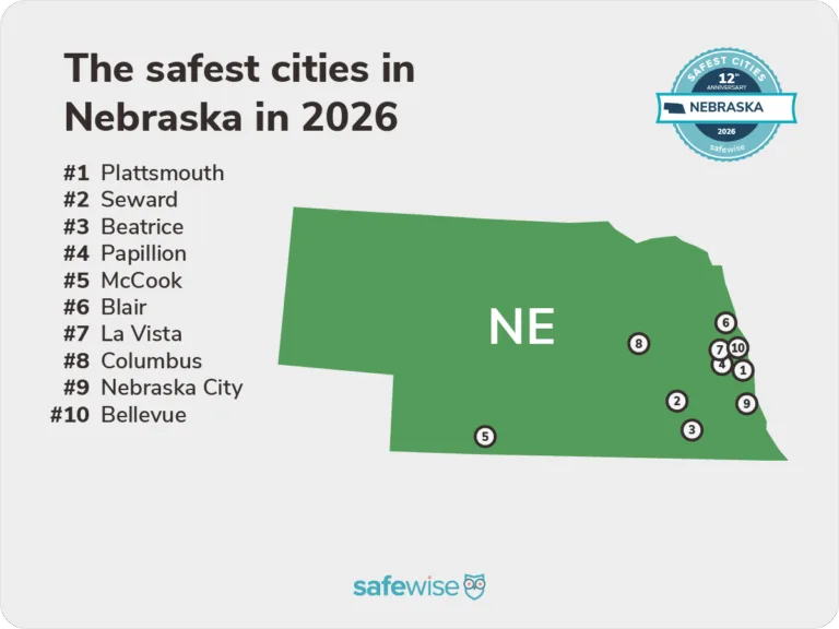 Map of the safest cities in Nebraska for 2026, listing top 10 ranked cities based on SafeWise crime data. Image: SafeWise