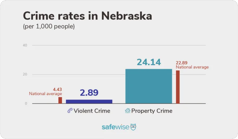 Bar chart comparing Nebraska violent and property crime rates to national averages. Nebraska's violent crime rate is below average and its property crime rate is above average. Image: SafeWise