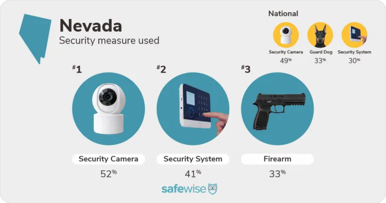 Top security measures used in Nevada (security cameras, security systems, and firearms) compared to national trends. Image: SafeWise