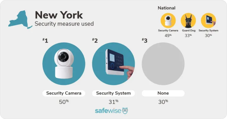 Top security measures used in New York (security cameras, security systems, and no security measures) compared to national trends. Image: SafeWise