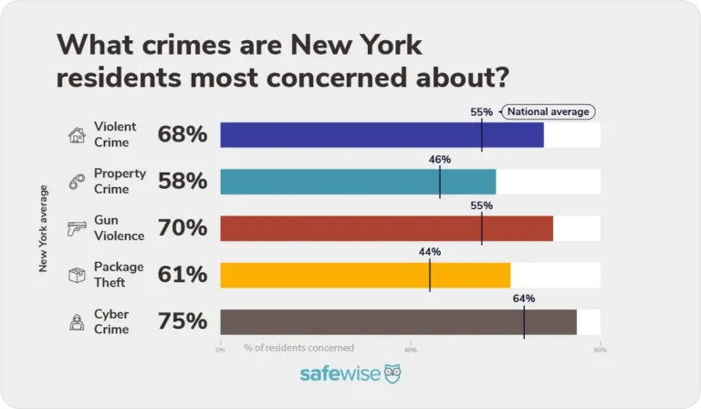 Bar chart showing the percentage of New York residents concerned about violent crime, property crime, gun violence, package theft, and cyber crime. Image: SafeWise