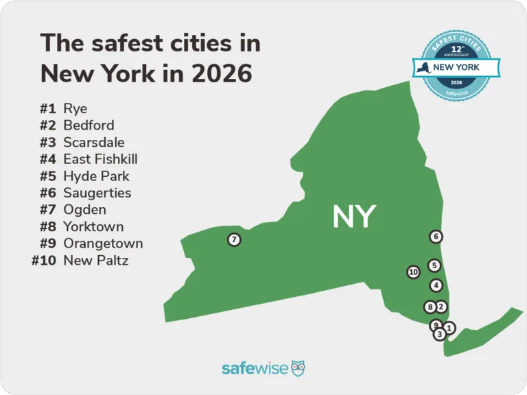Map of the safest cities in New York for 2026, listing top 10 ranked cities based on SafeWise crime data. Image: SafeWise