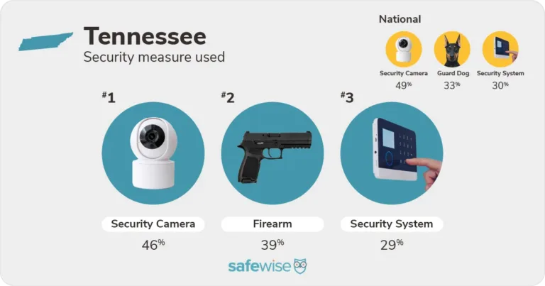 Top security measures used in Tennessee (security cameras, firearms, and security systems) compared to national trends. Image: SafeWise