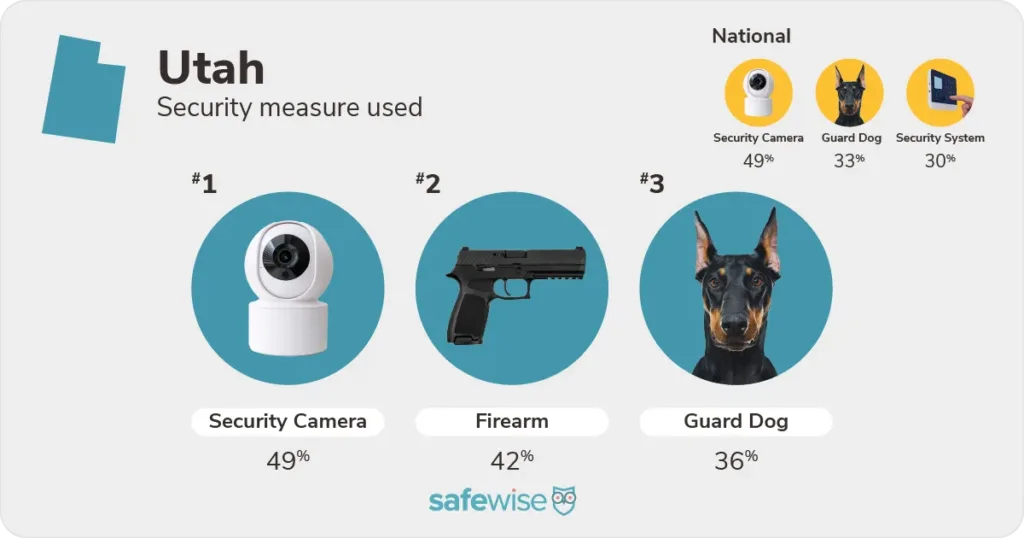 - Utah residents prefer to protect their property with security cameras (49%), firearms (42%), and guard dogs (36%).