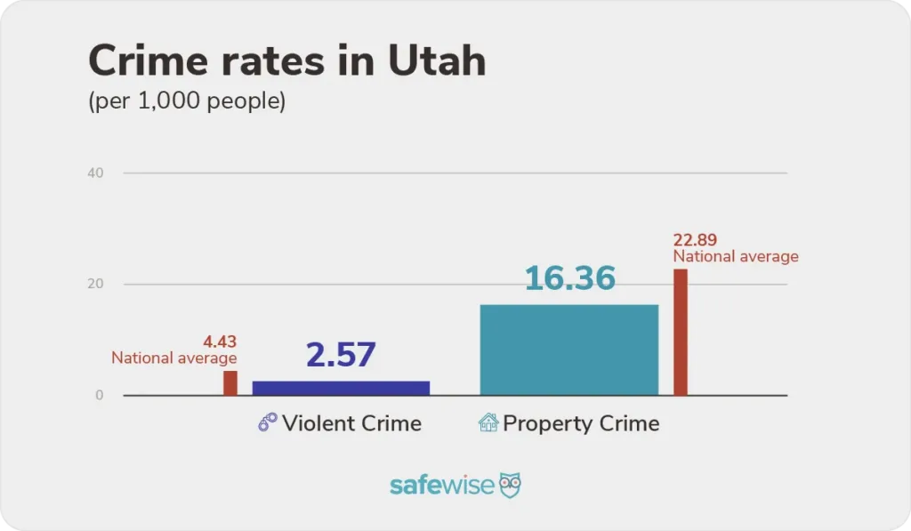 Bar chart comparing Utah violent and property crime rates to national averages. Utah is below average in both categories. Image: SafeWise