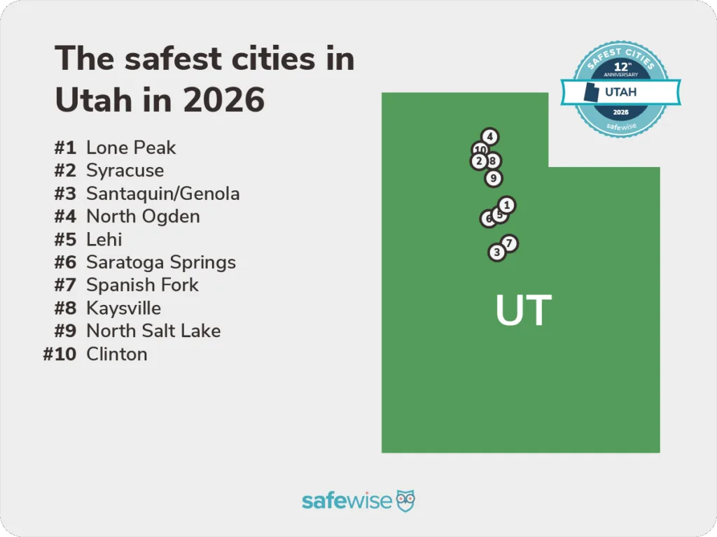 Map of the safest cities in Utah for 2026, listing top 10 ranked cities based on SafeWise crime data. Image: SafeWise
