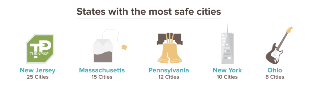 - New Jersey dominates the list for the second consecutive year with 25% of the safest cities in the country—but only one (Bergenfield) made it into the top five. Bergenfield also claimed the number three spot among the Garden State’s safest cities of 2020.