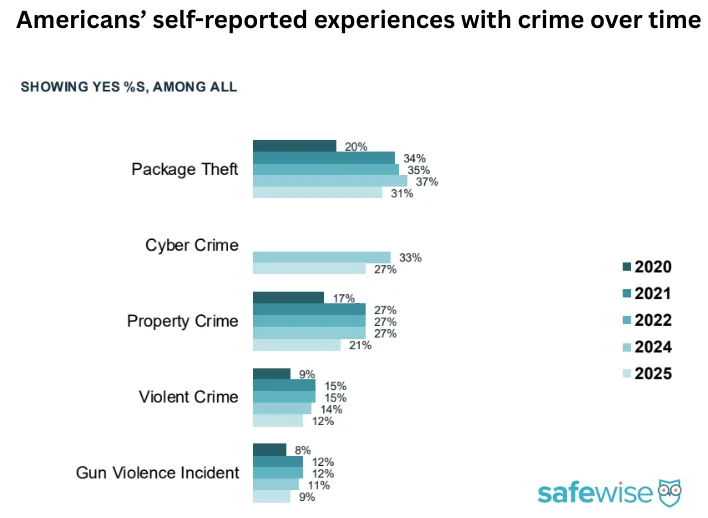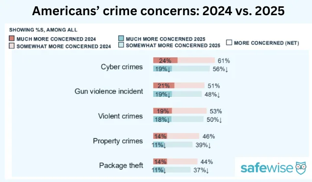 Interestingly, the percentage of Americans who worry about these crimes dropped in 2025 compared to 2024. Property crime and package theft concerns also declined year over year.