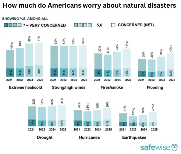 With recent events like the Los Angeles area fires, Texas floods, and ongoing extreme weather alerts across the country, it's no surprise that Americans are more worried about natural disasters than ever before. More than half of all survey respondents told us they're concerned about extreme weather and natural disasters, which is the highest level of concern we've seen.