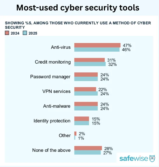 Anti-virus software is the most widely used cybersecurity tool. Image: SafeWise State of Safety report, D10. Do you currently use any of the following to provide cybersecurity? Among those who currently use a method of cybersecurity: 2025, 3589n; 2024, 3669n.