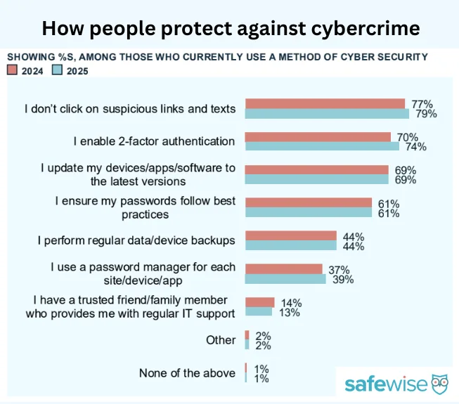 Most people avoid clicking on suspicious texts and links to protect against cybercrime. Image: SafeWise State of Safety report, D9. Which of the following best describes how you use cybersecurity measures? Among those who currently use a method of cybersecurity: 2025, 3589m; 2024, 3669n.