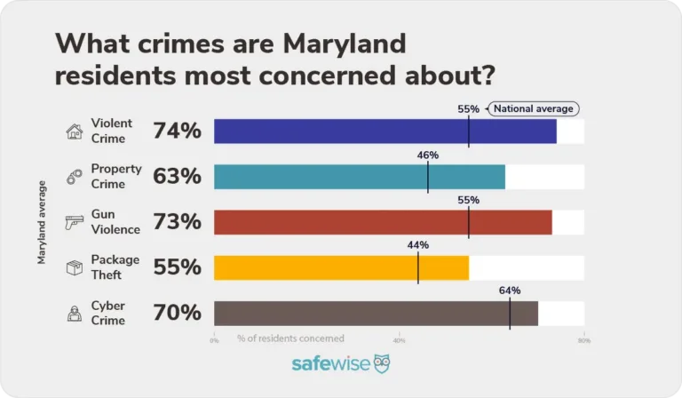 Bar chart showing the percentage of Maryland residents concerned about violent crime, property crime, gun violence, package theft, and cyber crime. Image: SafeWise